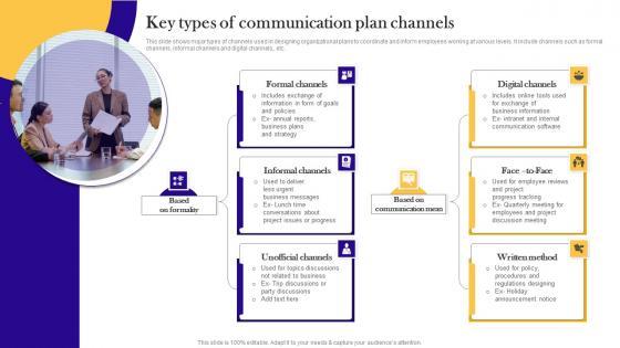 This slide shows major types of channels used in designing organizational plans to coordinate and inform employees working at various levels. It include channels such as formal channels, informal channels and digital channels,, etc.. Showcasing this set of slides titled Key Types Of Communication Plan Channels Background Pdf. The topics addressed in these templates are Digital Channels, Formal Channels, Informal Channels. All the content presented in this PPT design is completely editable. Download it and make adjustments in color, background, font etc. as per your unique business setting. This slide shows major types of channels used in designing organizational plans to coordinate and inform employees working at various levels. It include channels such as formal channels, informal channels and digital channels,, etc..