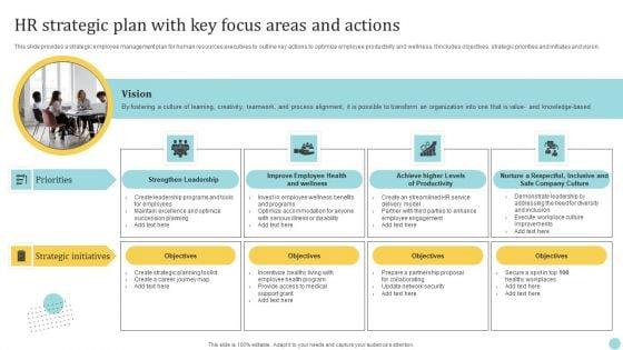 This slide provides a strategic employee management plan for human resources executives to outline key actions to optimize employee productivity and wellness. It includes objectives, strategic priorities and initiates and vision. Presenting HR Strategic Plan With Key Focus Areas And Actions Ideas PDF to dispense important information. This template comprises one stages. It also presents valuable insights into the topics including Strengthen Leadership, Improve Employee Health Wellness, Achieve Higher Levels. This is a completely customizable PowerPoint theme that can be put to use immediately. So, download it and address the topic impactfully.