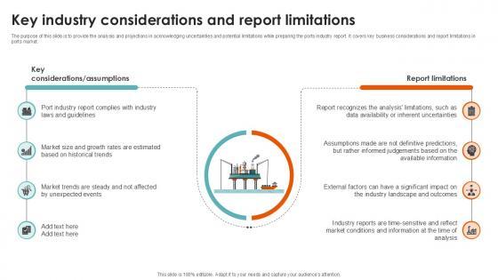 The purpose of this slide is to provide the analysis and projections in acknowledging uncertainties and potential limitations while preparing the ports industry report. It covers key business considerations and report limitations in ports market.Coming up with a presentation necessitates that the majority of the effort goes into the content and the message you intend to convey. The visuals of a PowerPoint presentation can only be effective if it supplements and supports the story that is being told. Keeping this in mind our experts created Key Industry Considerations And Port Terminal Industry Ppt Slide to reduce the time that goes into designing the presentation. This way, you can concentrate on the message while our designers take care of providing you with the right template for the situation. The purpose of this slide is to provide the analysis and projections in acknowledging uncertainties and potential limitations while preparing the ports industry report. It covers key business considerations and report limitations in ports market.