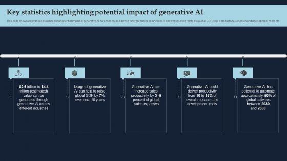This slide showcases various statistics about potential impact of generative AI on economy and across different business functions. It showcases stats related to global GDP, sales productivity, research and development costs etc. This modern and well-arranged Key Statistics Highlighting Potential Impact Of Generative AI Introduction PDF provides lots of creative possibilities. It is very simple to customize and edit with the Powerpoint Software. Just drag and drop your pictures into the shapes. All facets of this template can be edited with Powerpoint, no extra software is necessary. Add your own material, put your images in the places assigned for them, adjust the colors, and then you can show your slides to the world, with an animated slide included.