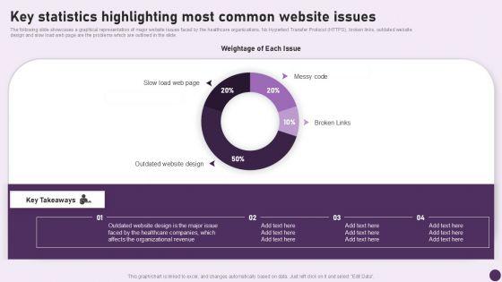 The following slide showcases a graphical representation of major website issues faced by the healthcare organizations. No Hypertext Transfer Protocol HTTPS, broken links, outdated website design and slow load web page are the problems which are outlined in the slide. The Key Statistics Highlighting Most Common Website Issues Diagrams PDF is a compilation of the most recent design trends as a series of slides. It is suitable for any subject or industry presentation, containing attractive visuals and photo spots for businesses to clearly express their messages. This template contains a variety of slides for the user to input data, such as structures to contrast two elements, bullet points, and slides for written information. Slidegeeks is prepared to create an impression.