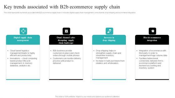 This slide represents key trends associated with b2b ecommerce supply chain. It includes digital supply chain management, omni channel, drop shipping and ecommerce integration. Do you have an important presentation coming up Are you looking for something that will make your presentation stand out from the rest Look no further than Key Trends Associated With B2B Ecommerce Supply Chain Download PDF. With our professional designs, you can trust that your presentation will pop and make delivering it a smooth process. And with Slidegeeks, you can trust that your presentation will be unique and memorable. So why wait Grab Key Trends Associated With B2B Ecommerce Supply Chain Download PDF today and make your presentation stand out from the rest.
