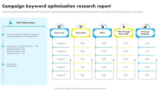 The following slide depicts the projected keyword improvement report to evaluate increase or decrease outcomes due to campaign efforts. It includes key elements such as impression, clicks, click through rate CTR, average ranking etc. The Search Engine Marketing Campaign Keyword Optimization Research Report Pictures PDF is a compilation of the most recent design trends as a series of slides. It is suitable for any subject or industry presentation, containing attractive visuals and photo spots for businesses to clearly express their messages. This template contains a variety of slides for the user to input data, such as structures to contrast two elements, bullet points, and slides for written information. Slidegeeks is prepared to create an impression.