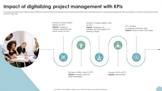 This slide represents details related to impact of effectively implementing structured approach for planning, implementing and sustaining changes in organizational projects with minimal disruptions. It includes impact of streamlining project management. This modern and well-arranged The Digital Project Managers Impact Of Digitalizing Project Management With Kpis provides lots of creative possibilities. It is very simple to customize and edit with the Powerpoint Software. Just drag and drop your pictures into the shapes. All facets of this template can be edited with Powerpoint, no extra software is necessary. Add your own material, put your images in the places assigned for them, adjust the colors, and then you can show your slides to the world, with an animated slide included. This slide represents details related to impact of effectively implementing structured approach for planning, implementing and sustaining changes in organizational projects with minimal disruptions. It includes impact of streamlining project management.