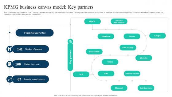 This slide covers key partners of KPMG helping to expand its operations in international markets. The purpose of this template is to provide an overview on total number of partners associated with KPMG, partner base score, recently added partners along with top partners list. Find a pre-designed and impeccable A24 The Ultimate Guide To KPMG Business Canvas Model Key Partners Strategy SS V. The templates can ace your presentation without additional effort. You can download these easy-to-edit presentation templates to make your presentation stand out from others. So, what are you waiting for Download the template from Slidegeeks today and give a unique touch to your presentation. This slide covers key partners of KPMG helping to expand its operations in international markets. The purpose of this template is to provide an overview on total number of partners associated with KPMG, partner base score, recently added partners along with top partners list.