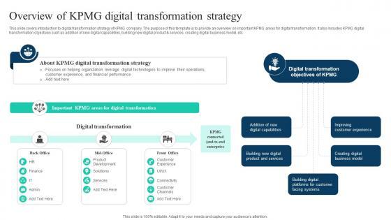 This slide covers introduction to digital transformation strategy of KPMG company. The purpose of this template is to provide an overview on important KPMG areas for digital transformation. It also includes KPMG digital transformation objectives such as addition of new digital capabilities, building new digital product and services, creating digital business model, etc. Boost your pitch with our creative A28 The Ultimate Guide To KPMG Overview Of KPMG Digital Transformation Strategy SS V. Deliver an awe-inspiring pitch that will mesmerize everyone. Using these presentation templates you will surely catch everyones attention. You can browse the ppts collection on our website. We have researchers who are experts at creating the right content for the templates. So you do not have to invest time in any additional work. Just grab the template now and use them. This slide covers introduction to digital transformation strategy of KPMG company. The purpose of this template is to provide an overview on important KPMG areas for digital transformation. It also includes KPMG digital transformation objectives such as addition of new digital capabilities, building new digital product and services, creating digital business model, etc.