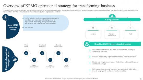 This slide covers introduction to KPMG strategy related to operations for business transformation. The purpose of this template is to provide an overview based on benefits of KPMG operational strategies along with insights and key operations at KPMG. It includes operations such as advisory, tax and legal services, audit, etc. Boost your pitch with our creative A25 The Ultimate Guide To KPMG Business Overview Of KPMG Operational Strategy SS V. Deliver an awe-inspiring pitch that will mesmerize everyone. Using these presentation templates you will surely catch everyones attention. You can browse the ppts collection on our website. We have researchers who are experts at creating the right content for the templates. So you do not have to invest time in any additional work. Just grab the template now and use them. This slide covers introduction to KPMG strategy related to operations for business transformation. The purpose of this template is to provide an overview based on benefits of KPMG operational strategies along with insights and key operations at KPMG. It includes operations such as advisory, tax and legal services, audit, etc.
