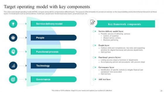 This slide covers target operating model of KPMG company along with its components in different layers. The purpose of this template is to provide an overview on the responsibilities and functions that are followed in all these layers. It include layers such as service delivery model layer, people layer, functional process layers, governance layer, etc. Whether you have daily or monthly meetings, a brilliant presentation is necessary. The Ultimate Guide To KPMG Target Operating Model With Key Components Strategy SS V can be your best option for delivering a presentation. Represent everything in detail using The Ultimate Guide To KPMG Target Operating Model With Key Components Strategy SS V and make yourself stand out in meetings. The template is versatile and follows a structure that will cater to your requirements. All the templates prepared by Slidegeeks are easy to download and edit. Our research experts have taken care of the corporate themes as well. So, give it a try and see the results. This slide covers target operating model of KPMG company along with its components in different layers. The purpose of this template is to provide an overview on the responsibilities and functions that are followed in all these layers. It include layers such as service delivery model layer, people layer, functional process layers, governance layer, etc.