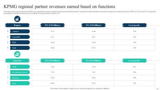 This slide covers revenue earned by KPMGs associated firms based on regions and services provided to clients. The purpose of this template is to provide comparison on revenue earned by KPMG for FY22 and FY21 and growth percentage. It includes functions such as auditing, tax and legal services, advisory, etc. Want to ace your presentation in front of a live audience Our The Ultimate Guide To KPMG Regional Partner Revenues Earned Based Strategy SS V can help you do that by engaging all the users towards you. Slidegeeks experts have put their efforts and expertise into creating these impeccable powerpoint presentations so that you can communicate your ideas clearly. Moreover, all the templates are customizable, and easy-to-edit and downloadable. Use these for both personal and commercial use. This slide covers revenue earned by KPMGs associated firms based on regions and services provided to clients. The purpose of this template is to provide comparison on revenue earned by KPMG for FY22 and FY21 and growth percentage. It includes functions such as auditing, tax and legal services, advisory, etc.