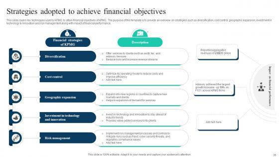 This slide covers key techniques used by KPMG to attain financial objectives of KPMG. The purpose of this template is to provide an overview on strategies such as diversification, cost control, geographic expansion, investment in technology and innovation and risk management along with impact of financial performance. From laying roadmaps to briefing everything in detail, our templates are perfect for you. You can set the stage with your presentation slides. All you have to do is download these easy-to-edit and customizable templates. The Ultimate Guide To KPMG Strategies Adopted To Achieve Financial Objectives Strategy SS V will help you deliver an outstanding performance that everyone would remember and praise you for. Do download this presentation today. This slide covers key techniques used by KPMG to attain financial objectives of KPMG. The purpose of this template is to provide an overview on strategies such as diversification, cost control, geographic expansion, investment in technology and innovation and risk management along with impact of financial performance.