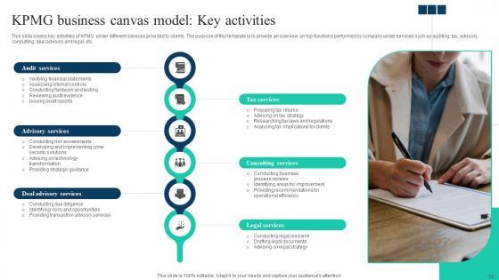 This slide covers key activities of KPMG under different services provided to clients. The purpose of this template is to provide an overview on top functions performed by company under services such as auditing, tax, advisory, consulting, deal advisory and legal, etc. Present like a pro with The Ultimate Guide To KPMG Business Transformational KPMG Business Canvas Strategy SS V. Create beautiful presentations together with your team, using our easy-to-use presentation slides. Share your ideas in real-time and make changes on the fly by downloading our templates. So whether you are in the office, on the go, or in a remote location, you can stay in sync with your team and present your ideas with confidence. With Slidegeeks presentation got a whole lot easier. Grab these presentations today. This slide covers key activities of KPMG under different services provided to clients. The purpose of this template is to provide an overview on top functions performed by company under services such as auditing, tax, advisory, consulting, deal advisory and legal, etc.