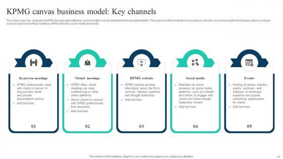This slide covers key channels of KPMG through which effective communication can be established among stakeholders. The purpose of this template is to provide an overview on communication techniques used by company such as in person and virtual meetings, KPMG website, social media and events. Do you have an important presentation coming up Are you looking for something that will make your presentation stand out from the rest Look no further than The Ultimate Guide To KPMG Canvas Business Model Key Channels Strategy SS V. With our professional designs, you can trust that your presentation will pop and make delivering it a smooth process. And with Slidegeeks, you can trust that your presentation will be unique and memorable. So why wait Grab The Ultimate Guide To KPMG Canvas Business Model Key Channels Strategy SS V today and make your presentation stand out from the rest This slide covers key channels of KPMG through which effective communication can be established among stakeholders. The purpose of this template is to provide an overview on communication techniques used by company such as in person and virtual meetings, KPMG website, social media and events.