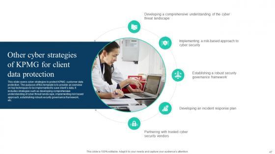 This slide covers cyber strategies to protect KPMG customer data protection. The purpose of this template is to provide an overview on top techniques to be implemented to save clients data. It includes strategies such as developing comprehensive understanding of cyber threat landscape, implementing risk based approach, establishing robust security governance framework, etc. Take your projects to the next level with our ultimate collection of The Ultimate Guide To KPMG Other Cyber Strategies Of KPMG For Client Data Strategy SS V. Slidegeeks has designed a range of layouts that are perfect for representing task or activity duration, keeping track of all your deadlines at a glance. Tailor these designs to your exact needs and give them a truly corporate look with your own brand colors they will make your projects stand out from the rest This slide covers cyber strategies to protect KPMG customer data protection. The purpose of this template is to provide an overview on top techniques to be implemented to save clients data. It includes strategies such as developing comprehensive understanding of cyber threat landscape, implementing risk based approach, establishing robust security governance framework, etc.