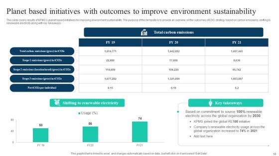 This slide covers results of KPMGs planet based initiatives for improving environment sustainability. The purpose of this template is to provide an overview on the outcomes of ESG strategy based on carbon emissions, shifting to renewable electricity along with key takeaways. Create an editable The Ultimate Guide To KPMG Planet Based Initiatives With Outcomes To Improve Strategy SS V that communicates your idea and engages your audience. Whether you are presenting a business or an educational presentation, pre-designed presentation templates help save time. The Ultimate Guide To KPMG Planet Based Initiatives With Outcomes To Improve Strategy SS V is highly customizable and very easy to edit, covering many different styles from creative to business presentations. Slidegeeks has creative team members who have crafted amazing templates. So, go and get them without any delay. This slide covers results of KPMGs planet based initiatives for improving environment sustainability. The purpose of this template is to provide an overview on the outcomes of ESG strategy based on carbon emissions, shifting to renewable electricity along with key takeaways.