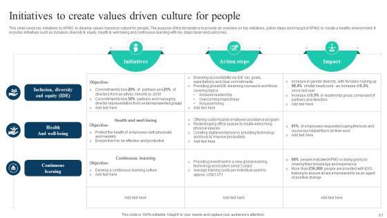This slide coves key initiatives by KPMG to develop values based on culture for people. The purpose of this template is to provide an overview on top initiatives, action steps and impact of KPMG to create a healthy environment. It includes initiatives such as inclusion, diversity and equity, health and well being and continuous learning with key steps taken and outcomes. Are you searching for a The Ultimate Guide To KPMG Initiatives To Create Values Driven Culture For People Strategy SS V that is uncluttered, straightforward, and original Its easy to edit, and you can change the colors to suit your personal or business branding. For a presentation that expresses how much effort you have put in, this template is ideal With all of its features, including tables, diagrams, statistics, and lists, its perfect for a business plan presentation. Make your ideas more appealing with these professional slides. Download The Ultimate Guide To KPMG Initiatives To Create Values Driven Culture For People Strategy SS V from Slidegeeks today. This slide coves key initiatives by KPMG to develop values based on culture for people. The purpose of this template is to provide an overview on top initiatives, action steps and impact of KPMG to create a healthy environment. It includes initiatives such as inclusion, diversity and equity, health and well being and continuous learning with key steps taken and outcomes.