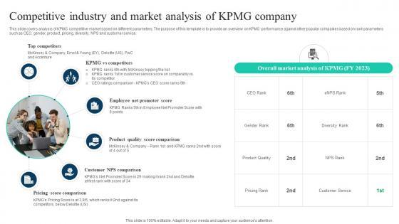 This slide covers analysis of KPMG competitive market based on different parameters. The purpose of this template is to provide an overview on KPMG performance against other popular companies based on rank parameters such as CEO, gender, product, pricing, diversity, NPS and customer service. If your project calls for a presentation, then Slidegeeks is your go-to partner because we have professionally designed, easy-to-edit templates that are perfect for any presentation. After downloading, you can easily edit The Ultimate Guide To KPMG Competitive Industry And Market Analysis Of KPMG Strategy SS V and make the changes accordingly. You can rearrange slides or fill them with different images. Check out all the handy templates This slide covers analysis of KPMG competitive market based on different parameters. The purpose of this template is to provide an overview on KPMG performance against other popular companies based on rank parameters such as CEO, gender, product, pricing, diversity, NPS and customer service.