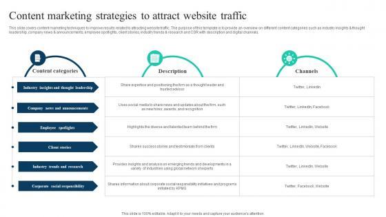 This slide covers content marketing techniques to improve results related to attracting website traffic. The purpose of this template is to provide an overview on different content categories such as industry insights and thought leadership, company news and announcements, employee spotlights, client stories, industry trends and research and CSR with description and digital channels. Are you in need of a template that can accommodate all of your creative concepts This one is crafted professionally and can be altered to fit any style. Use it with Google Slides or PowerPoint. Include striking photographs, symbols, depictions, and other visuals. Fill, move around, or remove text boxes as desired. Test out color palettes and font mixtures. Edit and save your work, or work with colleagues. Download The Ultimate Guide To KPMG Content Marketing Strategies To Attract Website Traffic Strategy SS V and observe how to make your presentation outstanding. Give an impeccable presentation to your group and make your presentation unforgettable. This slide covers content marketing techniques to improve results related to attracting website traffic. The purpose of this template is to provide an overview on different content categories such as industry insights and thought leadership, company news and announcements, employee spotlights, client stories, industry trends and research and CSR with description and digital channels.