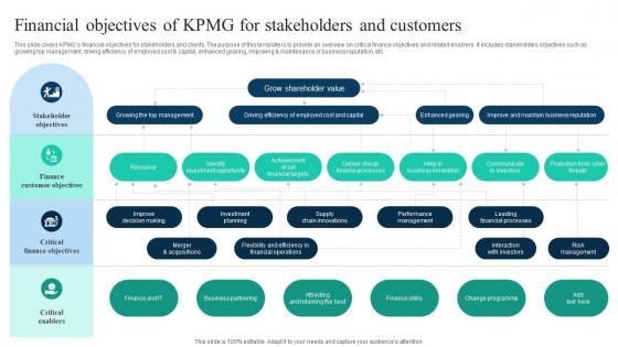 This slide covers KPMGs financial objectives for stakeholders and clients. The purpose of this template is to provide an overview on critical finance objectives and related enablers. It includes stakeholders objectives such as growing top management, driving efficiency of employed cost and capital, enhanced gearing, improving and maintenance of business reputation, etc. Make sure to capture your audiences attention in your business displays with our gratis customizable The Ultimate Guide To KPMG Financial Objectives Of KPMG For Stakeholders Strategy SS V. These are great for business strategies, office conferences, capital raising or task suggestions. If you desire to acquire more customers for your tech business and ensure they stay satisfied, create your own sales presentation with these plain slides. This slide covers KPMGs financial objectives for stakeholders and clients. The purpose of this template is to provide an overview on critical finance objectives and related enablers. It includes stakeholders objectives such as growing top management, driving efficiency of employed cost and capital, enhanced gearing, improving and maintenance of business reputation, etc.