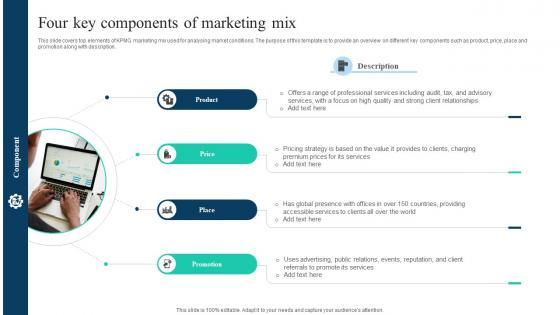 This slide covers top elements of KPMG marketing mix used for analysing market conditions. The purpose of this template is to provide an overview on different key components such as product, price, place and promotion along with description. Formulating a presentation can take up a lot of effort and time, so the content and message should always be the primary focus. The visuals of the PowerPoint can enhance the presenters message, so our The Ultimate Guide To KPMG Four Key Components Of Marketing Mix Strategy SS V was created to help save time. Instead of worrying about the design, the presenter can concentrate on the message while our designers work on creating the ideal templates for whatever situation is needed. Slidegeeks has experts for everything from amazing designs to valuable content, we have put everything into The Ultimate Guide To KPMG Four Key Components Of Marketing Mix Strategy SS V. This slide covers top elements of KPMG marketing mix used for analysing market conditions. The purpose of this template is to provide an overview on different key components such as product, price, place and promotion along with description.