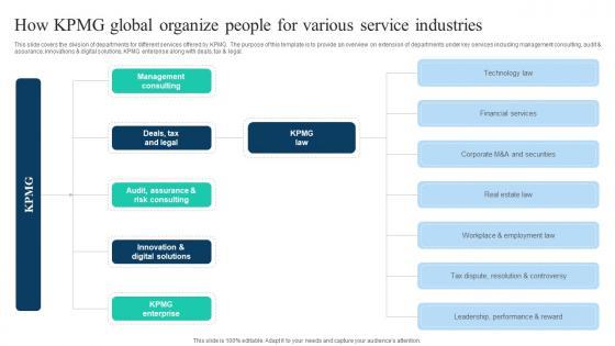This slide covers the division of departments for different services offered by KPMG. The purpose of this template is to provide an overview on extension of departments under key services including management consulting, audit and assurance, innovations and digital solutions, KPMG enterprise along with deals, tax and legal. Explore a selection of the finest The Ultimate Guide To KPMG How KPMG Global Organize People For Various Strategy SS V here. With a plethora of professionally designed and pre-made slide templates, you can quickly and easily find the right one for your upcoming presentation. You can use our The Ultimate Guide To KPMG How KPMG Global Organize People For Various Strategy SS V to effectively convey your message to a wider audience. Slidegeeks has done a lot of research before preparing these presentation templates. The content can be personalized and the slides are highly editable. Grab templates today from Slidegeeks. This slide covers the division of departments for different services offered by KPMG. The purpose of this template is to provide an overview on extension of departments under key services including management consulting, audit and assurance, innovations and digital solutions, KPMG enterprise along with deals, tax and legal.