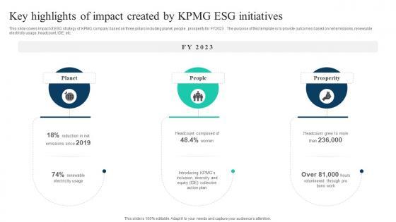 This slide covers impact of ESG strategy of KPMG company based on three pillars including planet, people , prosperity for FY2023 . The purpose of this template is to provide outcomes based on net emissions, renewable electricity usage, headcount, IDE, etc. Presenting this PowerPoint presentation, titled The Ultimate Guide To KPMG Key Highlights Of Impact Created By KPMG ESG Initiatives Strategy SS V, with topics curated by our researchers after extensive research. This editable presentation is available for immediate download and provides attractive features when used. Download now and captivate your audience. Presenting this The Ultimate Guide To KPMG Key Highlights Of Impact Created By KPMG ESG Initiatives Strategy SS V. Our researchers have carefully researched and created these slides with all aspects taken into consideration. This is a completely customizable The Ultimate Guide To KPMG Key Highlights Of Impact Created By KPMG ESG Initiatives Strategy SS V that is available for immediate downloading. Download now and make an impact on your audience. Highlight the attractive features available with our PPTs. This slide covers impact of ESG strategy of KPMG company based on three pillars including planet, people , prosperity for FY2023 . The purpose of this template is to provide outcomes based on net emissions, renewable electricity usage, headcount, IDE, etc