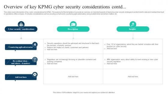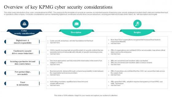 This slide covers introduction of key cyber considerations for KPMG. The purpose for this template is to provide an overview on important aspects of deploying cyber security strategies to protect clients data and maintain their trust in operations of the company. It includes considerations such as maintaining digital trust, unobtrusive security drives secure behaviours, securing perimeter less and data centric future, etc. with description and insights Find a pre-designed and impeccable The Ultimate Guide To KPMG Overview Of Key KPMG Cyber Security Considerations Strategy SS V. The templates can ace your presentation without additional effort. You can download these easy-to-edit presentation templates to make your presentation stand out from others. So, what are you waiting for Download the template from Slidegeeks today and give a unique touch to your presentation. This slide covers introduction of key cyber considerations for KPMG. The purpose for this template is to provide an overview on important aspects of deploying cyber security strategies to protect clients data and maintain their trust in operations of the company. It includes considerations such as maintaining digital trust, unobtrusive security drives secure behaviours, securing perimeter less and data centric future, etc. with description and insights