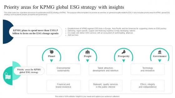 This slide covers key objectives and vision of sustainable and ESG strategy of KPMG. The purpose of this template is to provide an overview on general insights related to ESG. It also includes priority areas for KPMG global ESG strategy such as planet, people, prosperity and governance. Slidegeeks is one of the best resources for PowerPoint templates. You can download easily and regulate The Ultimate Guide To KPMG Priority Areas For KPMG Global ESG Strategy SS V for your personal presentations from our wonderful collection. A few clicks is all it takes to discover and get the most relevant and appropriate templates. Use our Templates to add a unique zing and appeal to your presentation and meetings. All the slides are easy to edit and you can use them even for advertisement purposes. This slide covers key objectives and vision of sustainable and ESG strategy of KPMG. The purpose of this template is to provide an overview on general insights related to ESG. It also includes priority areas for KPMG global ESG strategy such as planet, people, prosperity and governance.