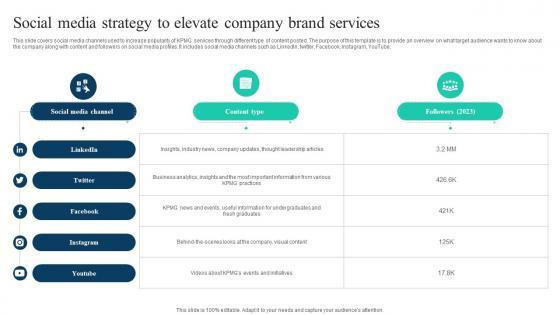 This slide covers social media channels used to increase popularity of KPMG services through different type of content posted. The purpose of this template is to provide an overview on what target audience wants to know about the company along with content and followers on social media profiles. It includes social media channels such as LinkedIn, twitter, Facebook, Instagram, YouTube. Get a simple yet stunning designed The Ultimate Guide To KPMG Social Media Strategy To Elevate Company Brand Strategy SS V. It is the best one to establish the tone in your meetings. It is an excellent way to make your presentations highly effective. So, download this PPT today from Slidegeeks and see the positive impacts. Our easy-to-edit The Ultimate Guide To KPMG Social Media Strategy To Elevate Company Brand Strategy SS V can be your go-to option for all upcoming conferences and meetings. So, what are you waiting for Grab this template today. This slide covers social media channels used to increase popularity of KPMG services through different type of content posted. The purpose of this template is to provide an overview on what target audience wants to know about the company along with content and followers on social media profiles. It includes social media channels such as LinkedIn, twitter, Facebook, Instagram, YouTube.