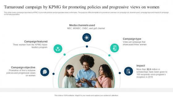 This slide covers campaign launched by KPMG to promote policies and progressive views on females. The purpose of this template is to provide an overview on campaign ad, channel used, campaign type and impact of campaign on female population. If you are looking for a format to display your unique thoughts, then the professionally designed The Ultimate Guide To KPMG Turnaround Campaign By KPMG For Promoting Strategy SS V is the one for you. You can use it as a Google Slides template or a PowerPoint template. Incorporate impressive visuals, symbols, images, and other charts. Modify or reorganize the text boxes as you desire. Experiment with shade schemes and font pairings. Alter, share or cooperate with other people on your work. Download The Ultimate Guide To KPMG Turnaround Campaign By KPMG For Promoting Strategy SS V and find out how to give a successful presentation. Present a perfect display to your team and make your presentation unforgettable. This slide covers campaign launched by KPMG to promote policies and progressive views on females. The purpose of this template is to provide an overview on campaign ad, channel used, campaign type and impact of campaign on female population.