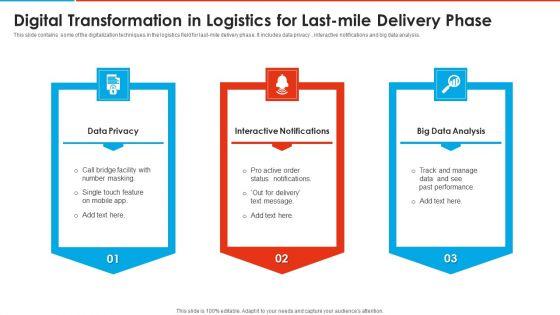 This slide contains some of the digitalization techniques in the logistics field for last-mile delivery phase. It includes data privacy , interactive notifications and big data analysis. Presenting Digital Transformation In Logistics For Last Mile Delivery Phase Demonstration PDF to dispense important information. This template comprises three stages. It also presents valuable insights into the topics including Interactive Notifications, Big Data Analysis, Data Privacy This is a completely customizable PowerPoint theme that can be put to use immediately. So, download it and address the topic impactfully.