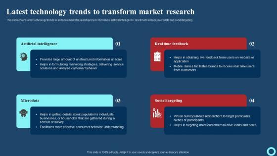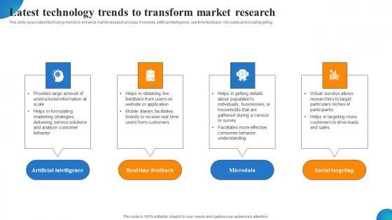 This slide covers latest technology trends to enhance market research process. It involves artificial intelligence, real time feedback, microdata and social targeting. Slidegeeks is one of the best resources for PowerPoint templates. You can download easily and regulate Latest Technology Trends To Transform Market Research Formats PDF for your personal presentations from our wonderful collection. A few clicks is all it takes to discover and get the most relevant and appropriate templates. Use our Templates to add a unique zing and appeal to your presentation and meetings. All the slides are easy to edit and you can use them even for advertisement purposes.