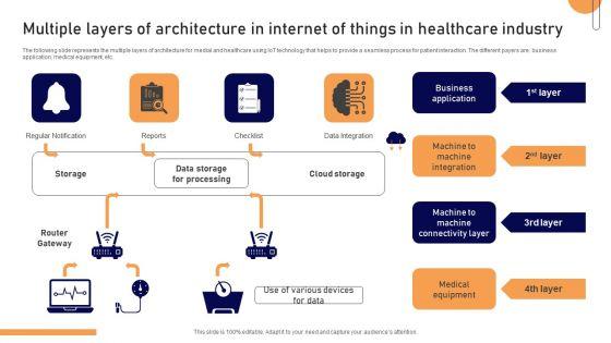 The following slide represents the multiple layers of architecture for medial and healthcare using IoT technology that helps to provide a seamless process for patient interaction. The different payers are business application, medical equipment, etc. Persuade your audience using this Multiple Layers Of Architecture In Internet Of Things In Healthcare Industry Elements PDF. This PPT design covers one stages, thus making it a great tool to use. It also caters to a variety of topics including Router Gateway, Cloud Storage, Medical Equipment, Data Storage For Processing. Download this PPT design now to present a convincing pitch that not only emphasizes the topic but also showcases your presentation skills.