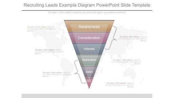 This is a recruiting leads example diagram powerpoint slide template. This is a six stage process. The stages in this process are awareness, consideration, interest, application, select, hire.