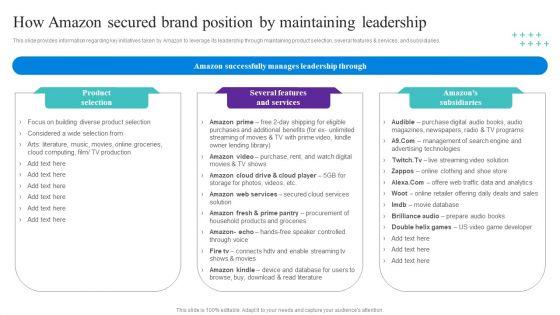 This slide provides information regarding key initiatives taken by Amazon to leverage its leadership through maintaining product selection, several features and services, and subsidiaries. This modern and well-arranged How Amazon Secured Brand Position By Maintaining Leadership Download PDF provides lots of creative possibilities. It is very simple to customize and edit with the Powerpoint Software. Just drag and drop your pictures into the shapes. All facets of this template can be edited with Powerpoint, no extra software is necessary. Add your own material, put your images in the places assigned for them, adjust the colors, and then you can show your slides to the world, with an animated slide included.