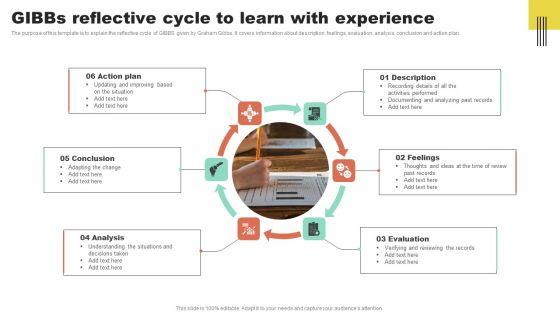 The purpose of this template is to explain the reflective cycle of GIBBS given by Graham Gibbs. It covers information about description, feelings, evaluation, analysis, conclusion and action plan. Presenting Gibbs Reflective Cycle To Learn With Experience Rules PDF to dispense important information. This template comprises six stages. It also presents valuable insights into the topics including Analysis, Conclusion, Action Plan. This is a completely customizable PowerPoint theme that can be put to use immediately. So, download it and address the topic impactfully.