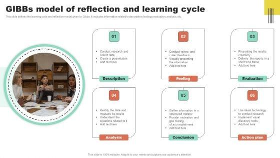 This slide defines the learning cycle and reflection model given by Gibbs. It includes information related to description, feelings evaluation, analysis, etc. Presenting Gibbs Model Of Reflection And Learning Cycle Formats PDF to dispense important information. This template comprises six stages. It also presents valuable insights into the topics including Feeling, Evaluation, Conclusion. This is a completely customizable PowerPoint theme that can be put to use immediately. So, download it and address the topic impactfully.