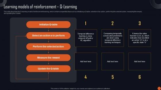 This slide describes the Q-learning model of reinforcement learning, which contains sequential steps such as initializing a Q-table, selection of an action, performing the selected action, measuring the reward, and updating the Q-table. Do you know about Slidesgeeks Learning Models Of Reinforcement Q Learning Ppt Layouts Design Inspiration PDF These are perfect for delivering any kind od presentation. Using it, create PowerPoint presentations that communicate your ideas and engage audiences. Save time and effort by using our pre designed presentation templates that are perfect for a wide range of topic. Our vast selection of designs covers a range of styles, from creative to business, and are all highly customizable and easy to edit. Download as a PowerPoint template or use them as Google Slides themes.