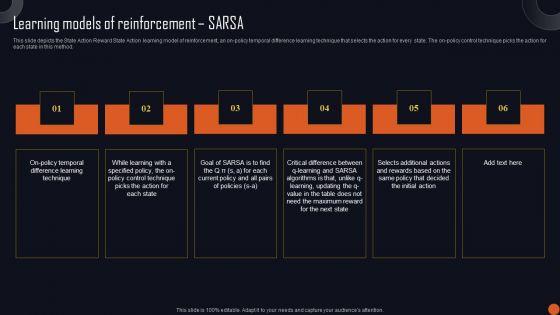 This slide depicts the State Action Reward State Action learning model of reinforcement, an on policy temporal difference learning technique that selects the action for every state. The on policy control technique picks the action for each state in this method.Explore a selection of the finest Types Of Reinforcement Learning In ML Learning Models Of Reinforcement Sarsa Professional PDF here. With a plethora of professionally designed and pre made slide templates, you can quickly and easily find the right one for your upcoming presentation. You can use our Types Of Reinforcement Learning In ML Learning Models Of Reinforcement Sarsa Professional PDF to effectively convey your message to a wider audience. Slidegeeks has done a lot of research before preparing these presentation templates. The content can be personalized and the slides are highly editable. Grab templates today from Slidegeeks.