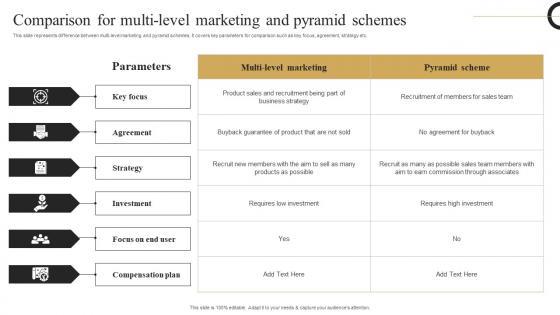 This slide represents difference between multi level marketing and pyramid schemes. It covers key parameters for comparison such as key focus, agreement, strategy etc. There are so many reasons you need a Comparison For Multi Level Strategic Plan Develop Multi Level Marketing Graphics Pdf. The first reason is you can not spend time making everything from scratch, Thus, Slidegeeks has made presentation templates for you too. You can easily download these templates from our website easily. This slide represents difference between multi level marketing and pyramid schemes. It covers key parameters for comparison such as key focus, agreement, strategy etc.