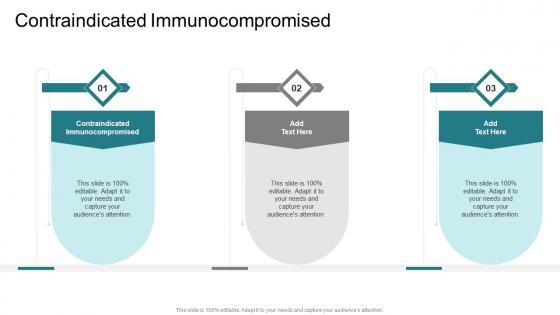 Presenting our innovatively designed set of slides titled Contraindicated Immunocompromised In Powerpoint And Google Slides Cpb. This completely editable PowerPoint graphic exhibits Contraindicated Immunocompromised that will help you convey the message impactfully. It can be accessed with Google Slides and is available in both standard screen and widescreen aspect ratios. Apart from this, you can download this well-structured PowerPoint template design in different formats like PDF, JPG, and PNG. So, click the download button now to gain full access to this PPT design. Our Contraindicated Immunocompromised In Powerpoint And Google Slides Cpb are topically designed to provide an attractive backdrop to any subject. Use them to look like a presentation pro.