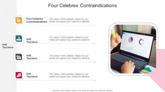 Introducing our well designed Four Celebrex Contraindications In Powerpoint And Google Slides Cpb This PowerPoint design presents information on topics like Four Celebrex Contraindications As it is predesigned it helps boost your confidence level. It also makes you a better presenter because of its high quality content and graphics. This PPT layout can be downloaded and used in different formats like PDF, PNG, and JPG. Not only this, it is available in both Standard Screen and Widescreen aspect ratios for your convenience. Therefore, click on the download button now to persuade and impress your audience. Our Four Celebrex Contraindications In Powerpoint And Google Slides Cpb are topically designed to provide an attractive backdrop to any subject. Use them to look like a presentation pro.