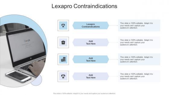 Introducing our well designed Lexapro Contraindications In Powerpoint And Google Slides Cpb This PowerPoint design presents information on topics like Lexapro Contraindications As it is predesigned it helps boost your confidence level. It also makes you a better presenter because of its high quality content and graphics. This PPT layout can be downloaded and used in different formats like PDF, PNG, and JPG. Not only this, it is available in both Standard Screen and Widescreen aspect ratios for your convenience. Therefore, click on the download button now to persuade and impress your audience. Our Lexapro Contraindications In Powerpoint And Google Slides Cpb are topically designed to provide an attractive backdrop to any subject. Use them to look like a presentation pro.