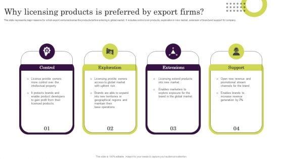 This slide represents major reasons for which export ventures license the products before entering in global market. It includes control over products, exploration in new market, extension of brand and support for company. Formulating a presentation can take up a lot of effort and time, so the content and message should always be the primary focus. The visuals of the PowerPoint can enhance the presenters message, so our Why Licensing Products Is Preferred By Export Firms Ppt Slides Images PDF was created to help save time. Instead of worrying about the design, the presenter can concentrate on the message while our designers work on creating the ideal templates for whatever situation is needed. Slidegeeks has experts for everything from amazing designs to valuable content, we have put everything into Why Licensing Products Is Preferred By Export Firms Ppt Slides Images PDF