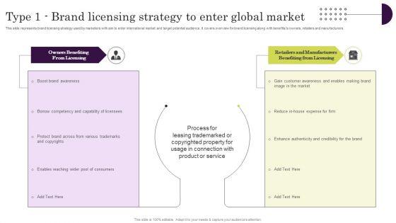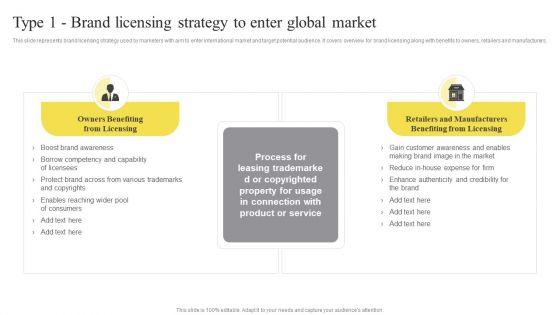 This slide represents brand licensing strategy used by marketers with aim to enter international market and target potential audience. It covers overview for brand licensing along with benefits to owners, retailers and manufacturers.From laying roadmaps to briefing everything in detail, our templates are perfect for you. You can set the stage with your presentation slides. All you have to do is download these easy-to-edit and customizable templates. Type 1 Brand Licensing Strategy To Enter Global International Marketing Strategy Information Pdf will help you deliver an outstanding performance that everyone would remember and praise you for. Do download this presentation today. This slide represents brand licensing strategy used by marketers with aim to enter international market and target potential audience. It covers overview for brand licensing along with benefits to owners, retailers and manufacturers.