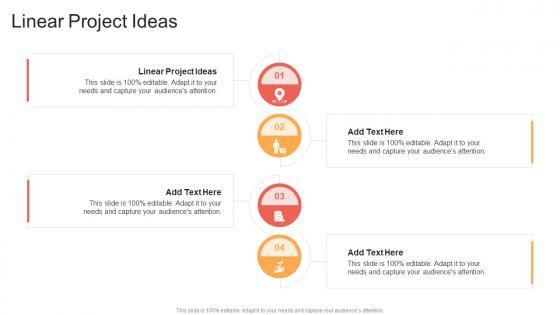 Introducing our well designed Linear Project Ideas In Powerpoint And Google Slides Cpb This PowerPoint design presents information on topics like Linear Project Ideas As it is predesigned it helps boost your confidence level. It also makes you a better presenter because of its high quality content and graphics. This PPT layout can be downloaded and used in different formats like PDF, PNG, and JPG. Not only this, it is available in both Standard Screen and Widescreen aspect ratios for your convenience. Therefore, click on the download button now to persuade and impress your audience. Our Linear Project Ideas In Powerpoint And Google Slides Cpb are topically designed to provide an attractive backdrop to any subject. Use them to look like a presentation pro.