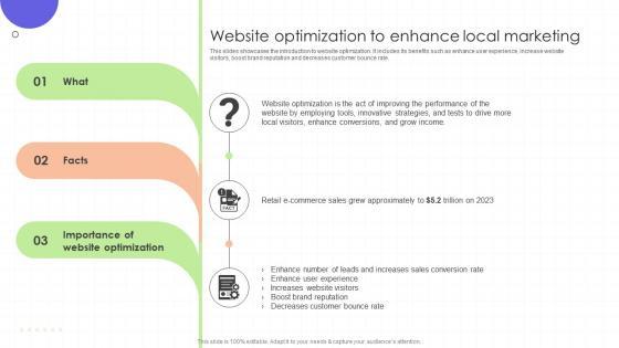 This slides showcases the introduction to website optimization. It includes its benefits such as enhance user experience, increase website visitors, boost brand reputation and decreases customer bounce rate.If your project calls for a presentation, then Slidegeeks is your go-to partner because we have professionally designed, easy-to-edit templates that are perfect for any presentation. After downloading, you can easily edit Website Optimization To Enhance Local Marketing Regional Marketing Plan To Boost Sales MKT SS and make the changes accordingly. You can rearrange slides or fill them with different images. Check out all the handy templates This slides showcases the introduction to website optimization. It includes its benefits such as enhance user experience, increase website visitors, boost brand reputation and decreases customer bounce rate.
