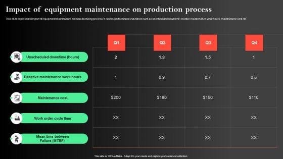 This slide represents impact of equipment maintenance on manufacturing process. It covers performance indicators such as unscheduled downtime, reactive maintenance work hours, maintenance cost etc. This modern and well arranged Manufacturing Operations Management Process Impact Of Equipment Maintenance On Production Background PDF provides lots of creative possibilities. It is very simple to customize and edit with the Powerpoint Software. Just drag and drop your pictures into the shapes. All facets of this template can be edited with Powerpoint no extra software is necessary. Add your own material, put your images in the places assigned for them, adjust the colors, and then you can show your slides to the world, with an animated slide included.