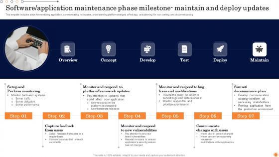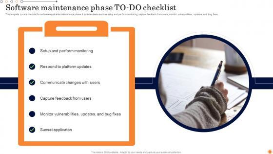This template covers checklist for software application maintenance phase. It includes tasks such as setup and perform monitoring, capture feedback from users, monitor vulnerabilities , updates, and bug fixes . Slidegeeks is here to make your presentations a breeze with Design And Develop Customized Software Guides Software Maintenance Phase Slides Pdf With our easy to use and customizable templates, you can focus on delivering your ideas rather than worrying about formatting. With a variety of designs to choose from, you are sure to find one that suits your needs. And with animations and unique photos, illustrations, and fonts, you can make your presentation pop. So whether you are giving a sales pitch or presenting to the board, make sure to check out Slidegeeks first This template covers checklist for software application maintenance phase. It includes tasks such as setup and perform monitoring, capture feedback from users, monitor vulnerabilities , updates, and bug fixes .