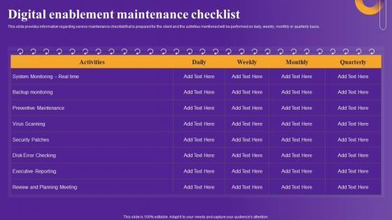 This slide provides information regarding service maintenance checklist that is prepared for the client and the activities mentioned will be performed on daily, weekly, monthly or quarterly basis. Slidegeeks is here to make your presentations a breeze with Digital Enablement Maintenance Checklist Organisational Digital Innovation Designs PDF With our easy-to-use and customizable templates, you can focus on delivering your ideas rather than worrying about formatting. With a variety of designs to choose from, you are sure to find one that suits your needs. And with animations and unique photos, illustrations, and fonts, you can make your presentation pop. So whether you are giving a sales pitch or presenting to the board, make sure to check out Slidegeeks first This slide provides information regarding service maintenance checklist that is prepared for the client and the activities mentioned will be performed on daily, weekly, monthly or quarterly basis.