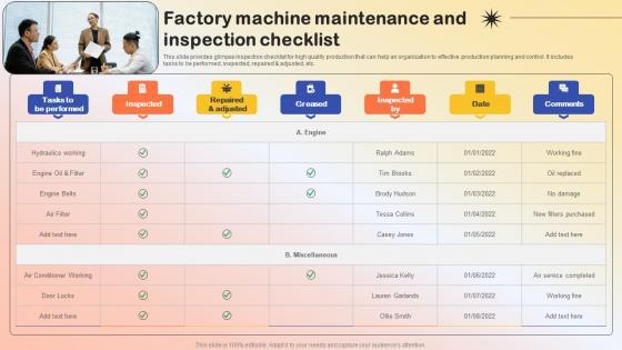 This slide provides glimpse inspection checklist for high quality production that can help an organization to effective production planning and control. It includes tasks to be performed, inspected, repaired and adjusted, etc. From laying roadmaps to briefing everything in detail, our templates are perfect for you. You can set the stage with your presentation slides. All you have to do is download these easy-to-edit and customizable templates. Factory Machine Maintenance And Inspection Streamlining Production Operational Demonstration PDF will help you deliver an outstanding performance that everyone would remember and praise you for. Do download this presentation today. This slide provides glimpse inspection checklist for high quality production that can help an organization to effective production planning and control. It includes tasks to be performed, inspected, repaired and adjusted, etc.